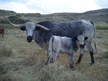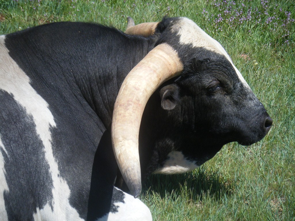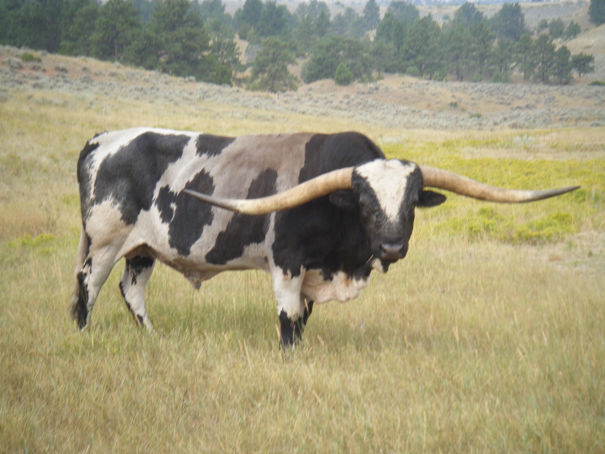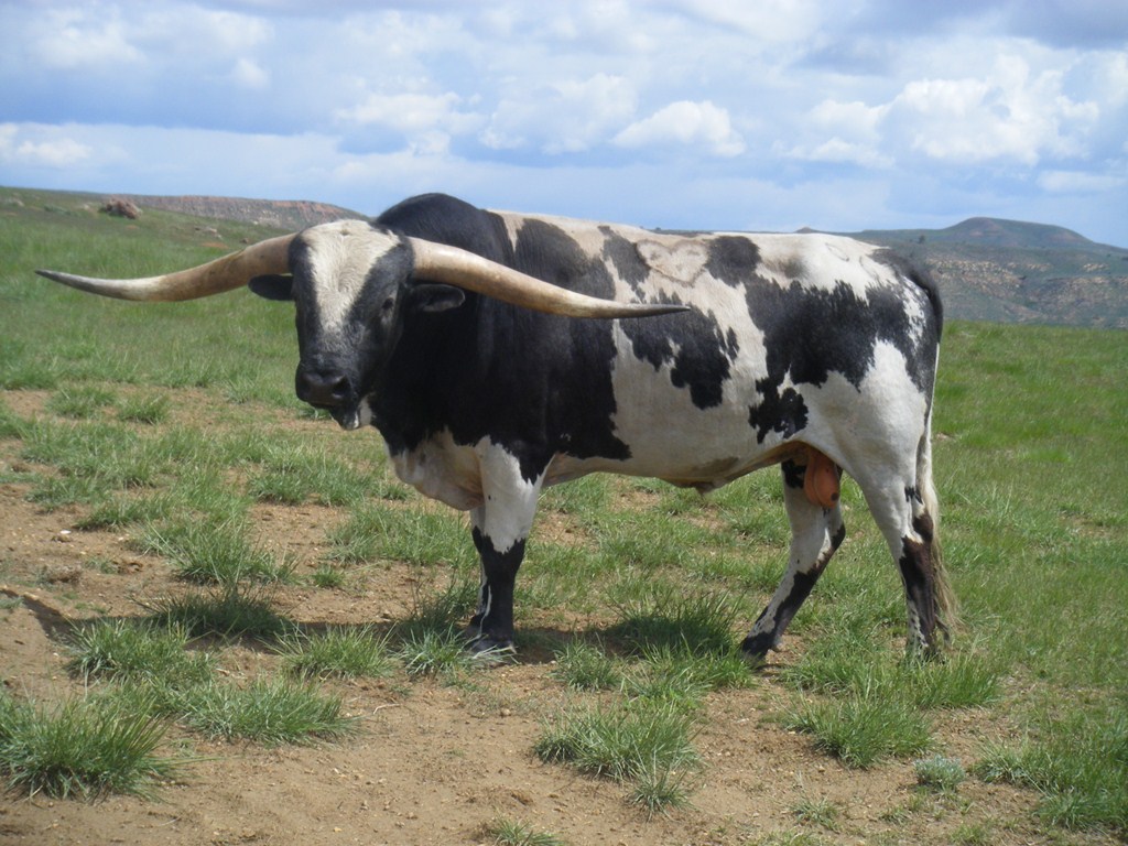 Saddlehorn is a very flashy bull with extremely flat lean back horn. 86 1/4 on 6-16-17. Tested by University of California,Davis Laboratory to be Homozygous Black. All his calves will be from the black family, he cannot produce red. Is a consistent producer of blue and black and white paint calves. Now AI Certified. Semen for sale at 75.00 per straw.